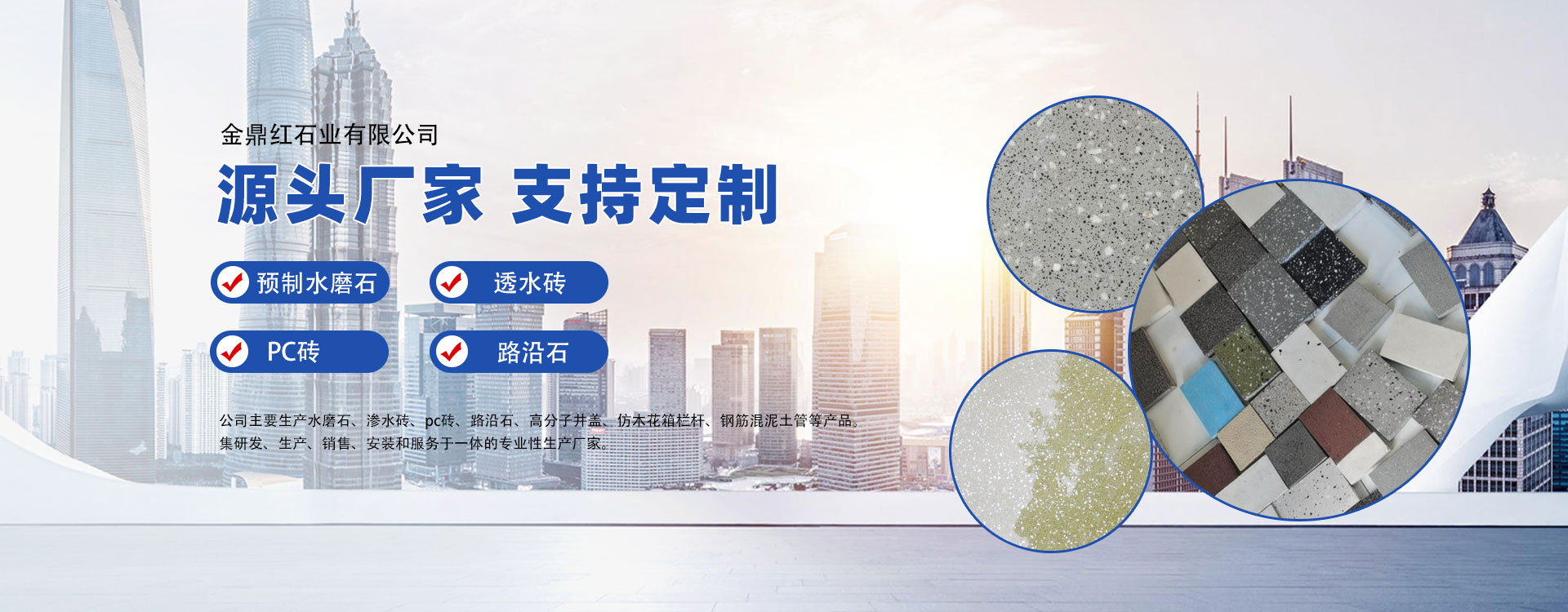 金鼎紅石業有限公司成立于2017年,通過兩年發展,在2019年由小規模企業升為一般納稅人企業,現發展成為一家集研發、生產、銷售、安裝和服務于一體的專業性生產廠家。 公司主要生產水磨石磚、墻面干掛(適用于廣場,酒店,車站,學校,醫院,家裝,會議室,會所,辦公室,農家樂等)、透水磚、PC磚、路沿石、高分子井蓋、鋼筋混凝土管等產品。 公司本著“誠信創新永恒·產品人品同在”的宗旨,堅持“工廠出產的不僅僅是產品,更重要的是信譽和質量”的經...
